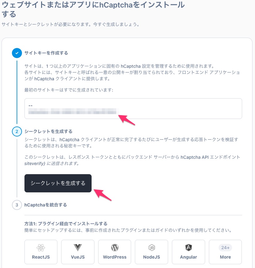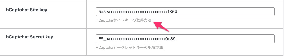 今回は気が変わったので赤い矢印のひとつ下の「hCaptcha」を設定いたします。