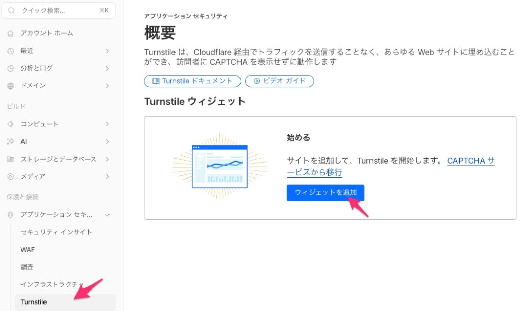ダッシュボードに入ったら、Turnstileを押下、ウィジェットを追加を押下します(下図参照)。