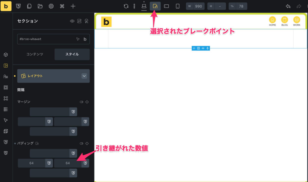 ブレークポイントを切り替えると、上位(優先)ブレークポイントの数値が引き継がれます。