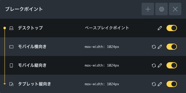 どうしてもElementorと比較してしまいますが、Elementorではデスクトップとスマホだけのブレークポイントの設定はありませんが、Bricksではその設定があります。